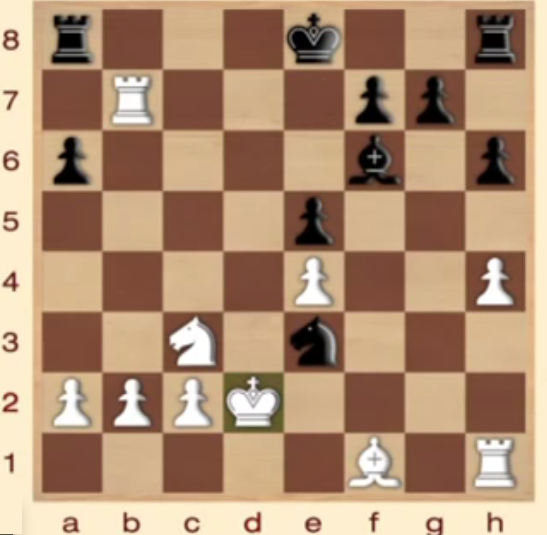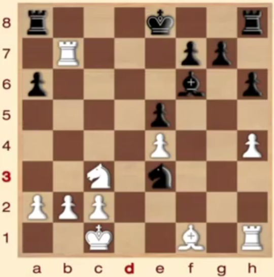 5. Juegan las blancas y Ganan. Con un tema idéntico al del video las blancas se pueden ganar la torre negra. ( El blanco puede enrocar largo si lo desea) . Encuentre la respuesta